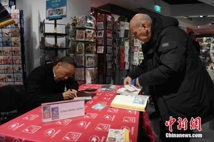 ▲法国邮政在巴黎举行兔年生肖邮票发行仪式,迎接中国农历新年。陈江洪为现场的法国民众签名留念。李洋 摄