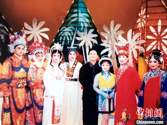 ▲1995年5月,台湾艺人白冰冰(右三)在台湾中华电视台演播厅主持漳州歌仔戏团赴台演出的宣传活动时与郑娅玲(左四)一行合影。(受访者供图)
