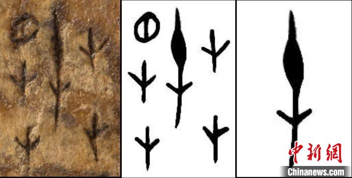 ▲左图为刻于甲骨上的“春”字彩照,中图为甲骨文“春”字摹本,右图为甲骨文“春”字中的“屯”。(受访者供图)