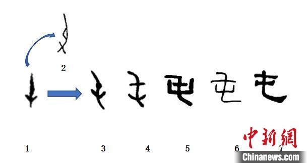 ▲“屯”字字形演变示意,1、2为甲骨文,3、4为金文,5、6为篆书,7为隶书。(受访者供图)