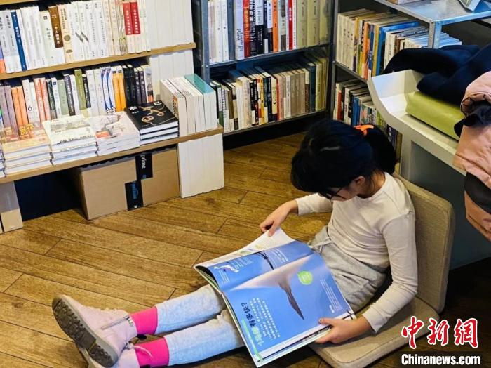 ▲近日,一个华裔女孩在卜卜书斋阅读中文书。(受访者供图)