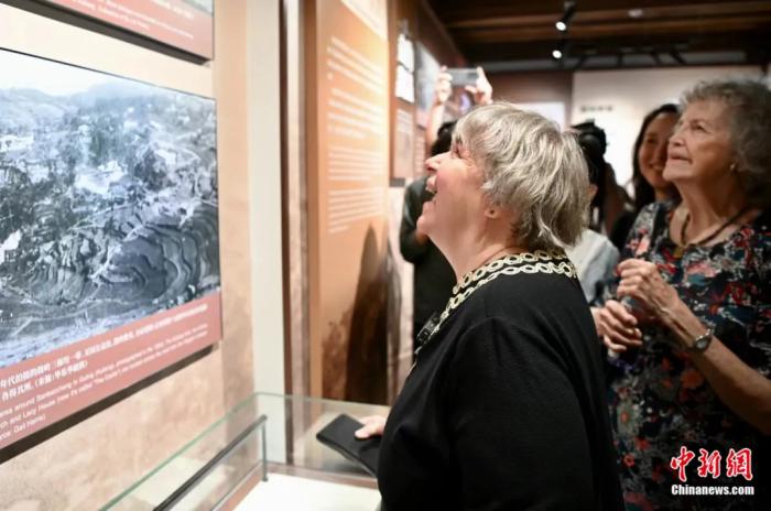 ▲2024年6月22日,穆蔼仁家族后人穆言灵(前)与柯志仁家族后人毕乐华观看鼓岭历史照片。王东明 摄