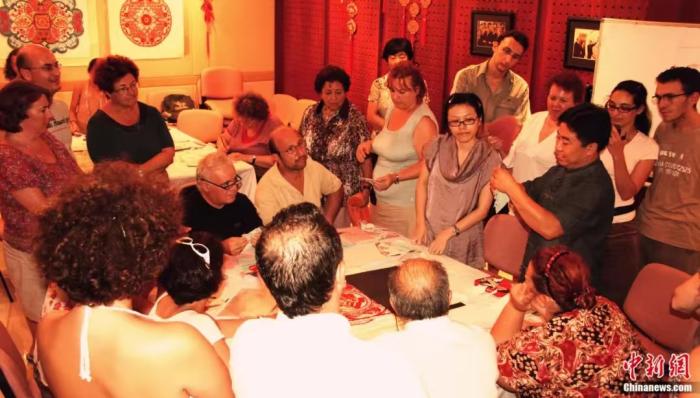▲段建珺应邀赴马耳他为当地民众教授剪纸。呼和浩特市官方供图