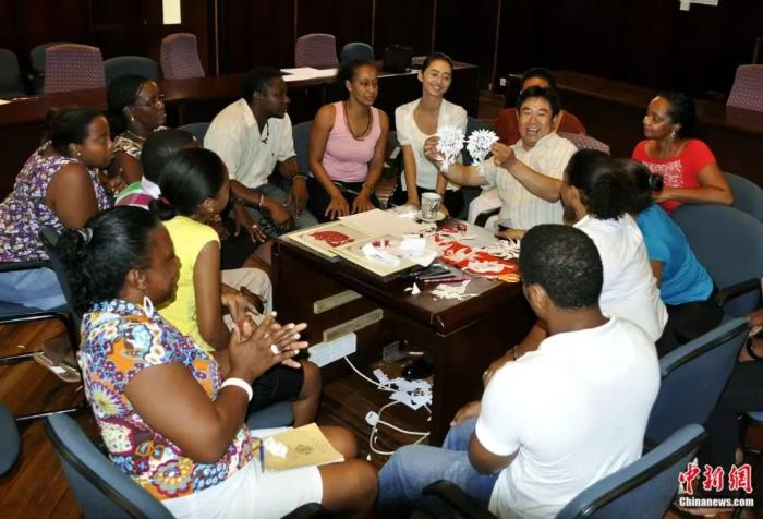 ▲段建珺在非洲传授剪纸。(2013年8月,塞舌尔)呼和浩特市官方供图