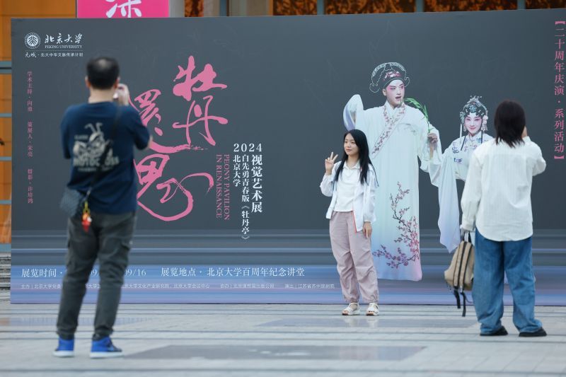 ▲2024年9月14日,青年观众在北京大学百周年纪念讲堂外与演出宣传海报合影。(图片来自中新社)