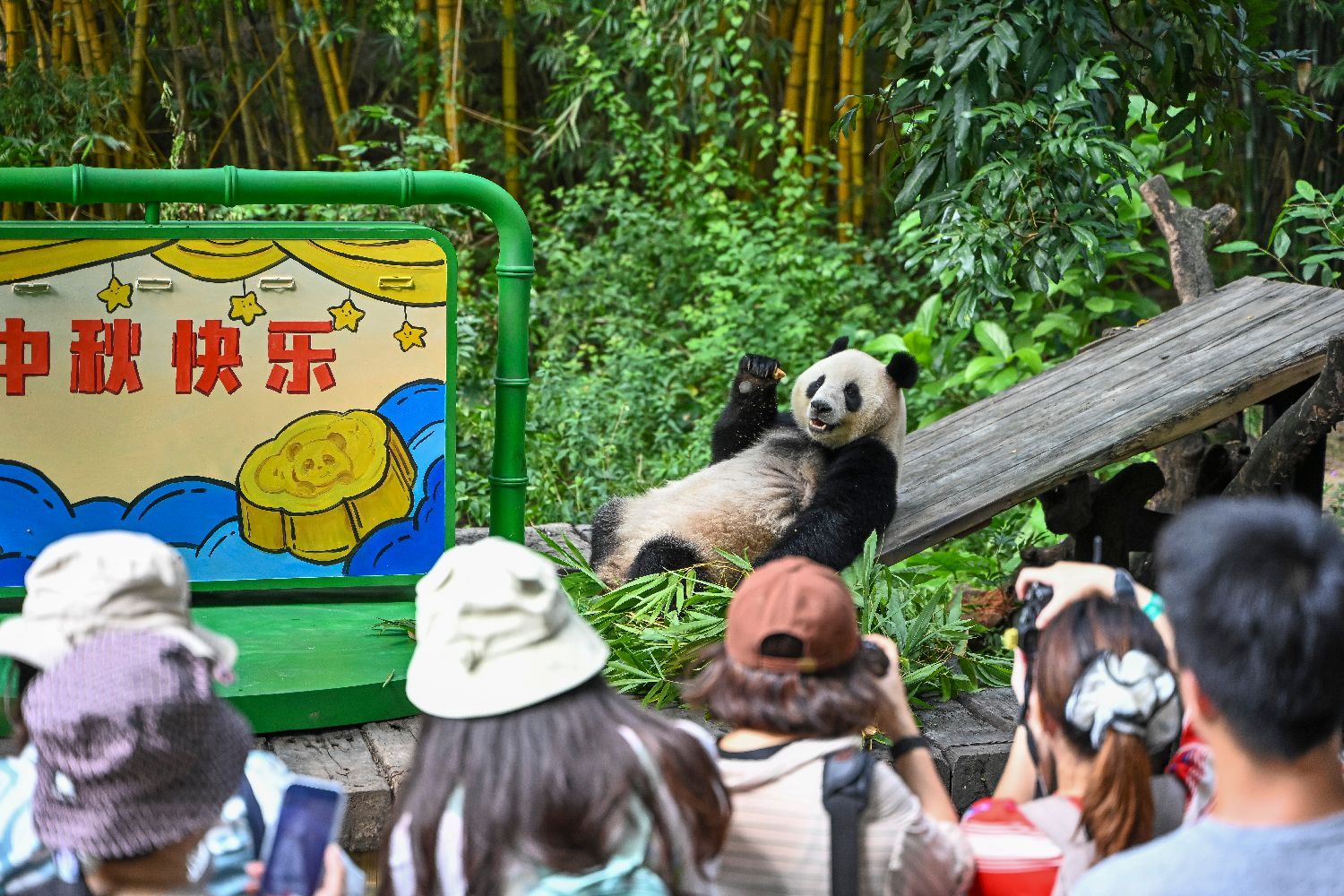 ▲9月13日,广东广州,食用特制“月饼”的大熊猫“国庆”吸引游客。当日,长隆野生动物世界为大熊猫举办中秋主题食物丰容活动,保育团队利用胡萝卜、竹笋等食材为大熊猫制作“熊猫月饼”。(图片来自中新社)