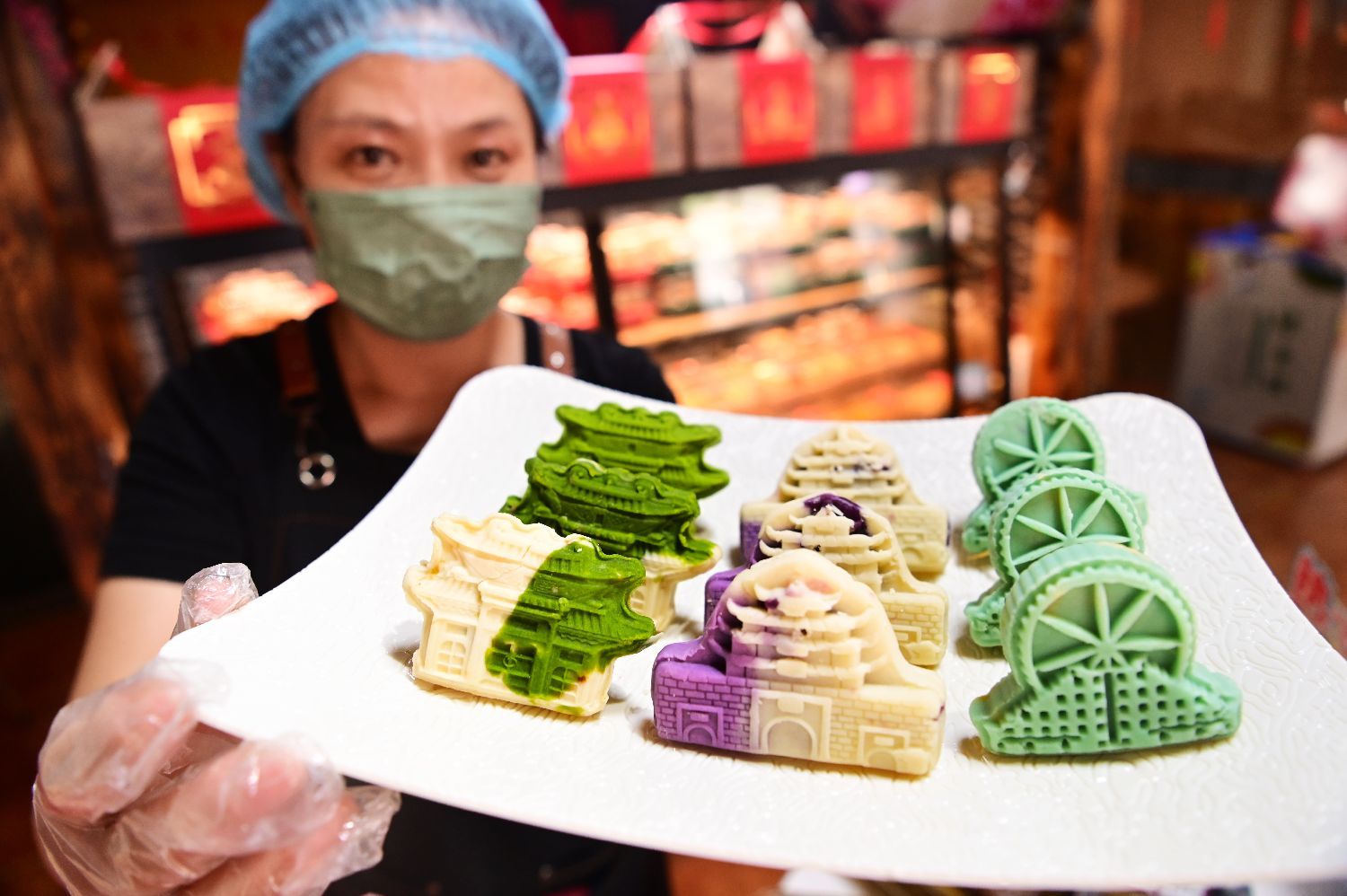 ▲9月13日,在山东省聊城市中华水上古城区景区端慕糕点店,工作人员在展示带有聊城文化地标元素的文创月饼。(图片来自中新社)
