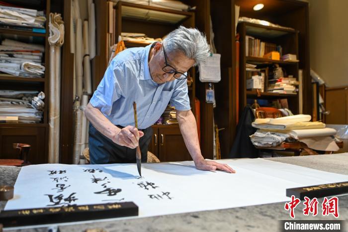 ▲赵浩如在其艺术工作室内书写毛笔字。(图片来自中新网)