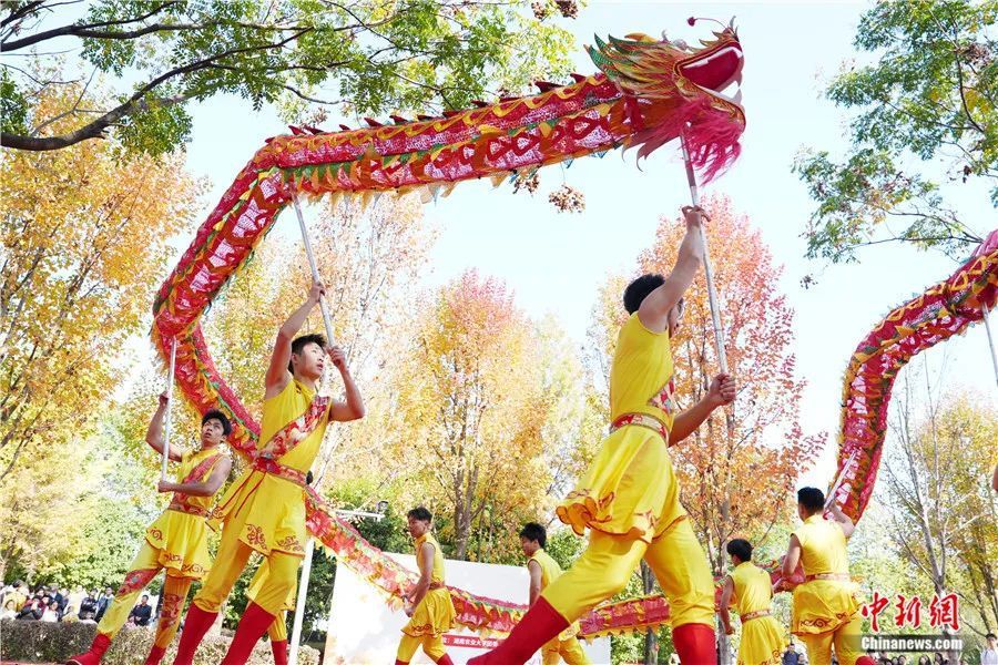 ▲2024年11月30日,湖南农业大学2024年红枫文化节开幕,校内的枫叶迎来了一年中最佳观赏时期,大学生们在枫树下进行华服走秀、舞龙、跳民俗舞蹈等表演。中新社记者杨华峰 摄