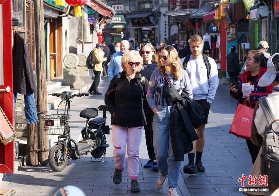 ▲2024年10月23日是二十四节气中的霜降,外国游客在北京什刹海地区的胡同内参观游览。中新社记者贾天勇 摄