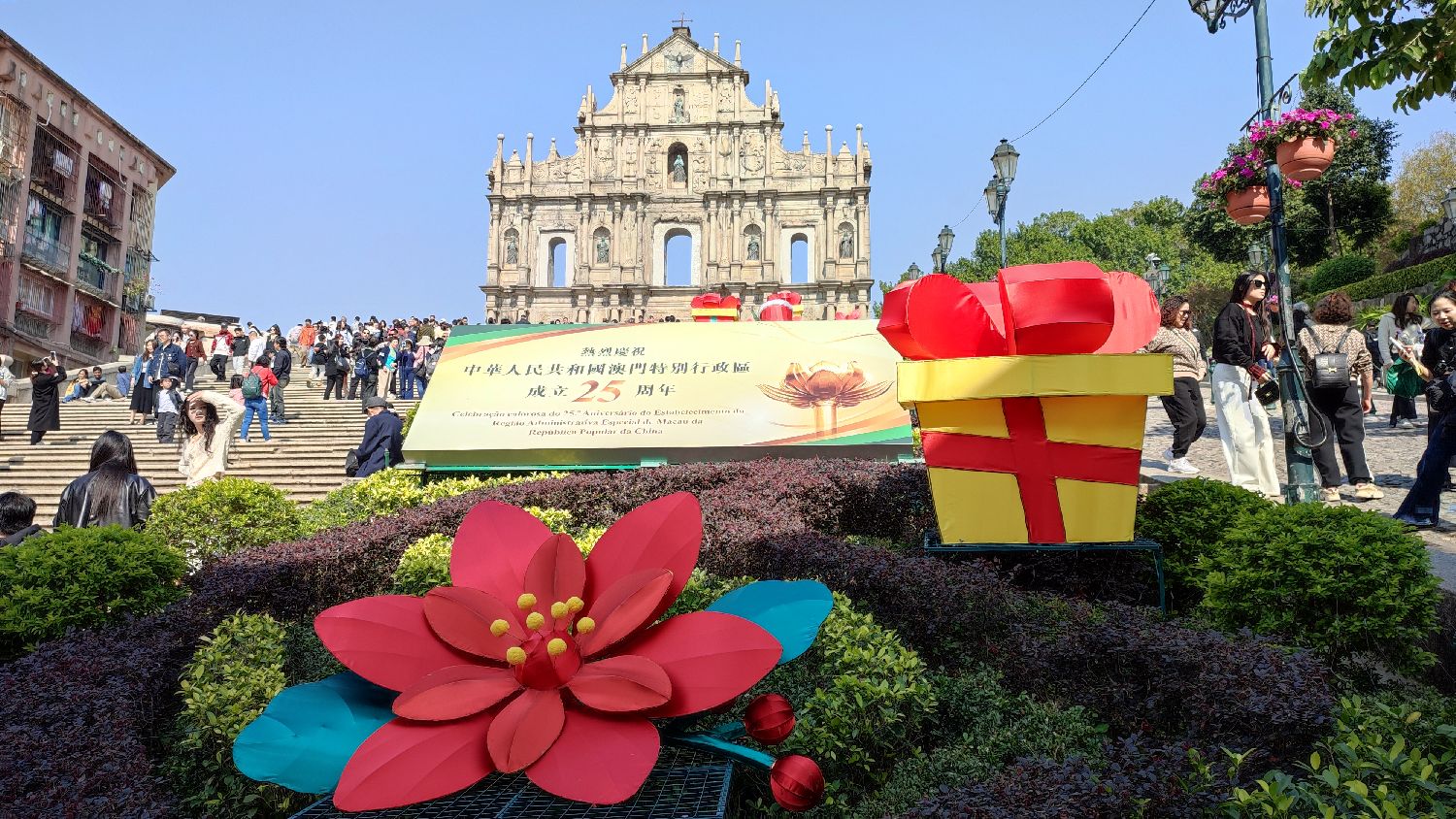 ▲在澳门街头随处可见迎回归的大型装置、宣传标语。(图片来自中新社)