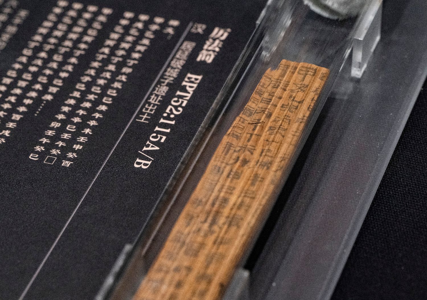 ▲2023年,“二十世纪初中国古文献四大发现展”上,“居延汉简”展区中展示的一条“历法简”的真迹实物展品。(图片来自中新社)