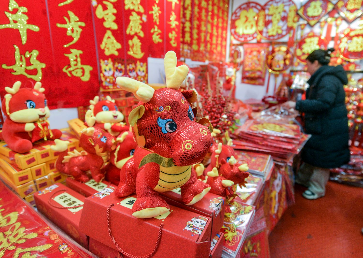 ▲1月18日,农历腊月初八,新疆乌鲁木齐市商贸城新春饰品销售区,市民选购各类蕴含“龙元素”的春联、中国结、玩偶等新春饰品装饰居所。(图片来自中新社)