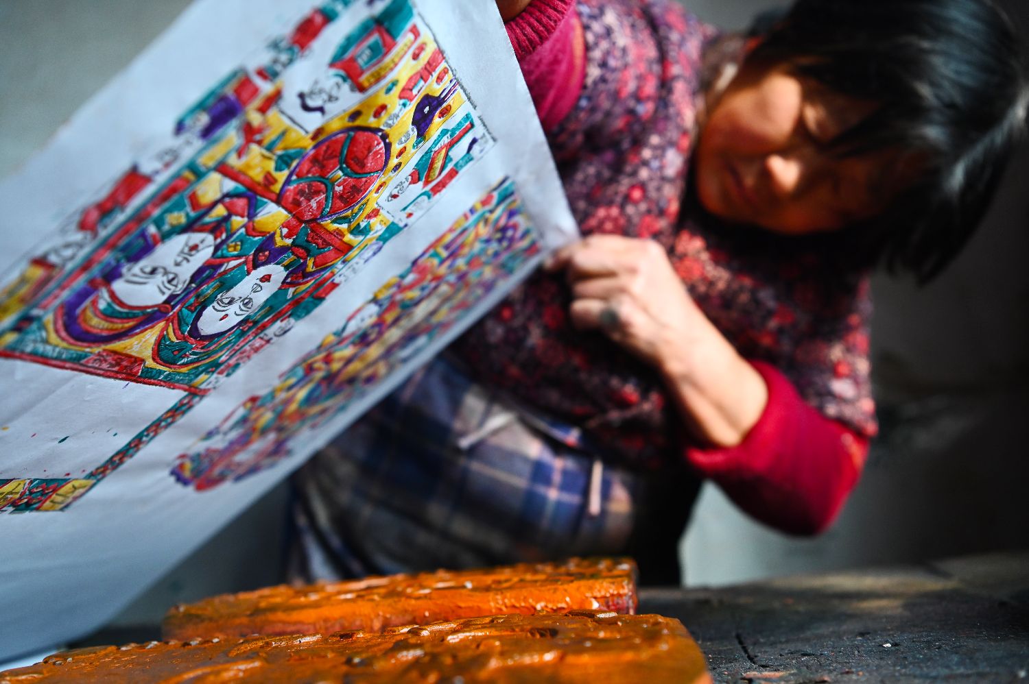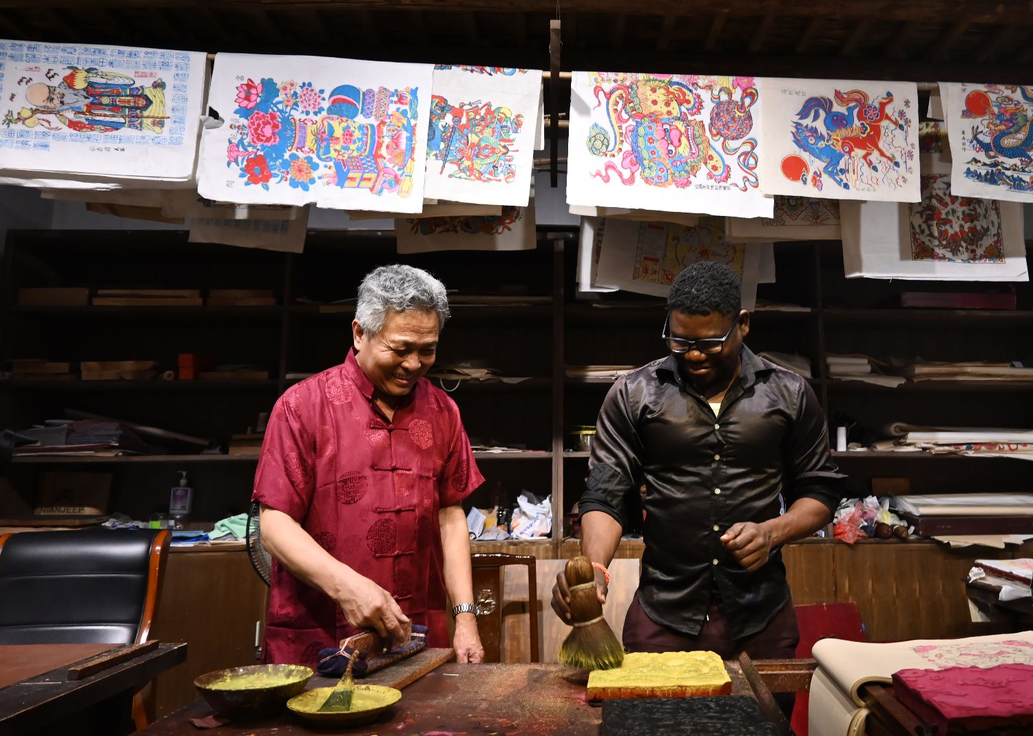 ▲东昌府木版年画艺人在印制年画。(图片来自中新社)
