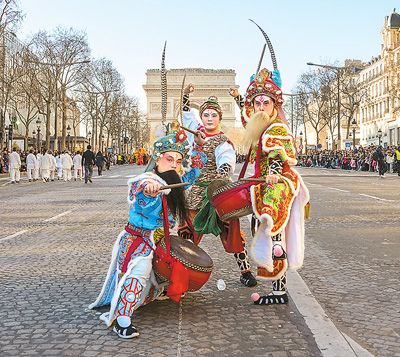 激昂有力的鼓点、刚柔并济的动作、变化多样的阵型……来自广东汕头潮阳的西门英歌队,一登场就成为法国巴黎香榭丽舍大街春节巡游活动的焦点。花木兰、穆桂英、水浒梁山好汉,这些中国传统文化中极具代表性的英雄角色与巴黎地标凯旋门“同框”,碰撞出奇妙的火花。至此,西门英歌队蛇年新春欧洲之行在农历大年初五(当地时间2月2日)抵达了此次巡演的终点站——巴黎。在这之前,西门英歌队一行25人,先后前往德国哈瑙、法兰克福以及法国里昂等地,为当地市民和游客带来精彩的表演,送去浓浓的新春祝福。