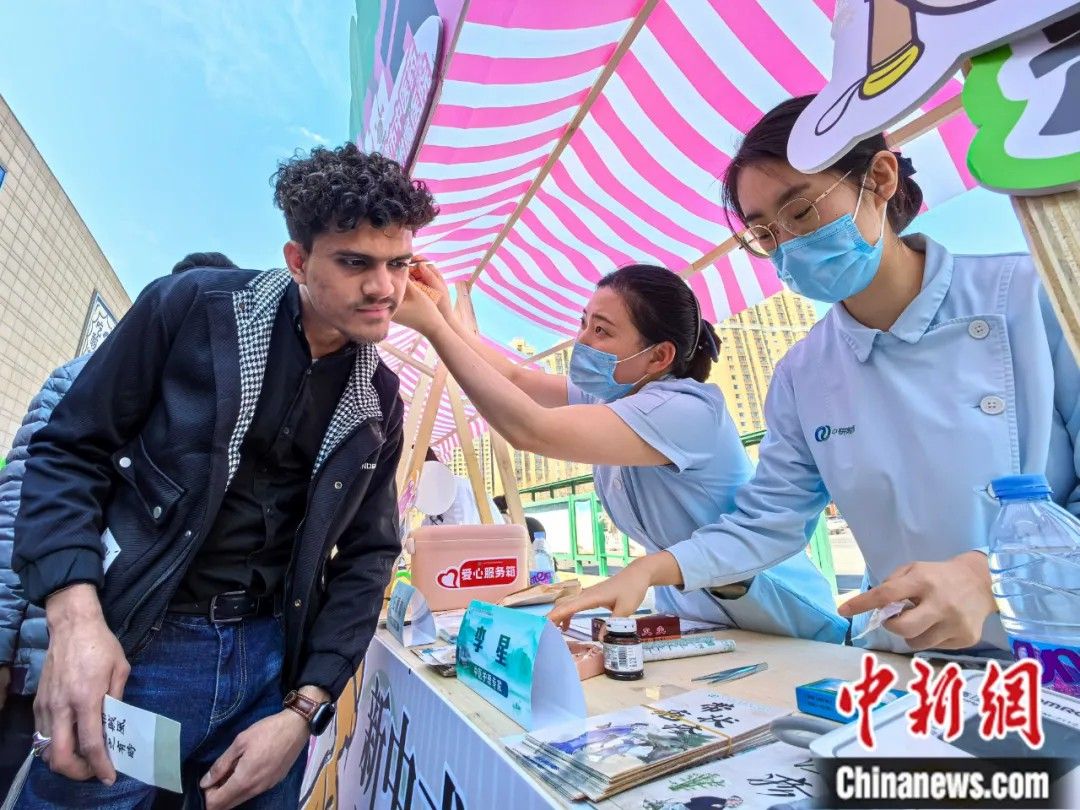 ▲2025年3月21日,2025年天津市中医文化市集首站在天津市红桥区启幕。图为巴基斯坦留学生体验中医耳针。中新社记者 佟郁 摄