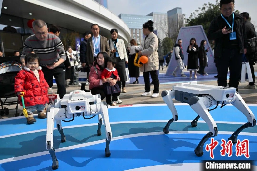 ▲2025年3月19日,“开启大模型•遇见机器人”——四川省人工智能产业链产品发布会在成都举行。图为四足机器人吸引参观者。中新社记者 张浪 摄
