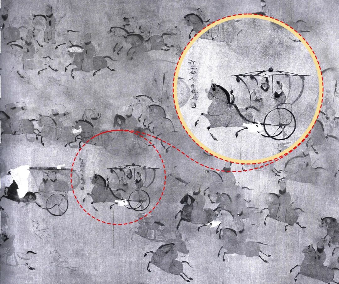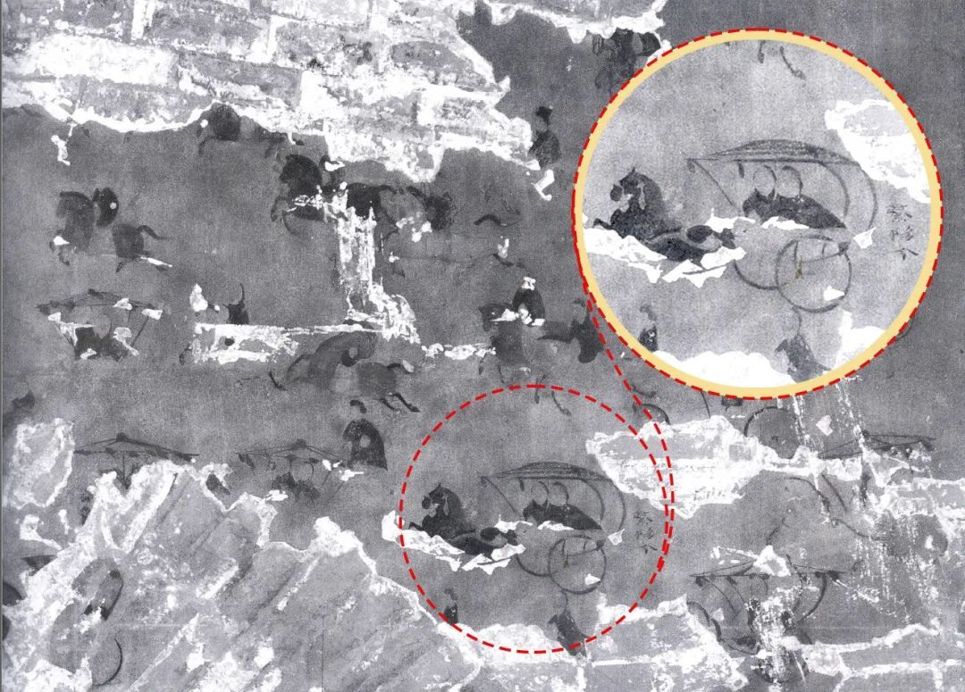 在“西河长史”出行图中,阚如端坐主车,前拥后簇着众多从骑和侍卫,队列中还有身着赭红衣、边行边猎的匈奴人。
