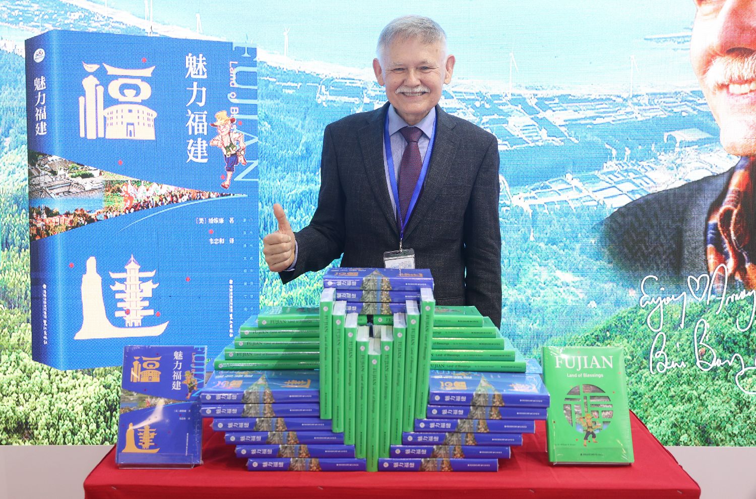 ▲6月18日,读者与潘维廉合影。当日,《魅力福建》的作者,厦门大学美籍教授潘维廉(William N.Brown)亲临图博会现场,为新书揭幕。(李国庆 摄)