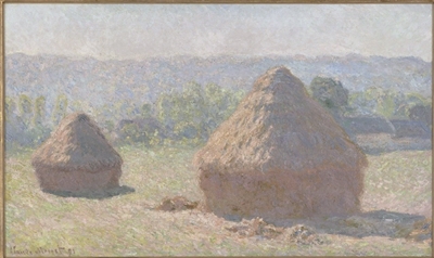 另一件1891年的《夏末的干草堆》是与睡莲齐名的系列作品中的一件。这些“干草堆”事实上是巨大的玉米堆。而翻译成“干草堆”或“干草垛”是对法语“Meules”的误译。莫奈描绘它们是“屹立在悬崖前的独居的金字塔”。大约在1889年岁末,莫奈开始了第一批谷堆画的创作。