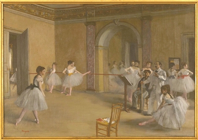 虽然德加参加了几届印象派的画展,但他并不愿意被当作是印象派中的一员。德加反对外光画法,只在早年随马奈画过一批赛马与骑手的作品,后来就彻底转入室内,并且迅速选定了一生的主题:芭蕾舞女和舞蹈排练现场。