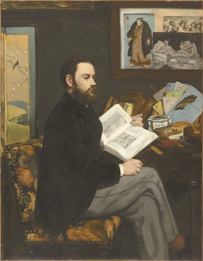 马奈作于1868年的名画《埃米尔·左拉》突显了画家擅用黑色的特点。小说家左拉的黑色上衣衬出他的严肃性,而背后墙上的布置藏着那个时期巴黎艺术新风尚的秘密——浮世绘小画点明此时巴黎的潮流正转向东方,从平面性绘画中汲取养分;另一幅小画是马奈的《奥林匹亚》小稿,原作在1865年的官方沙龙展上曾引起轩然大波。