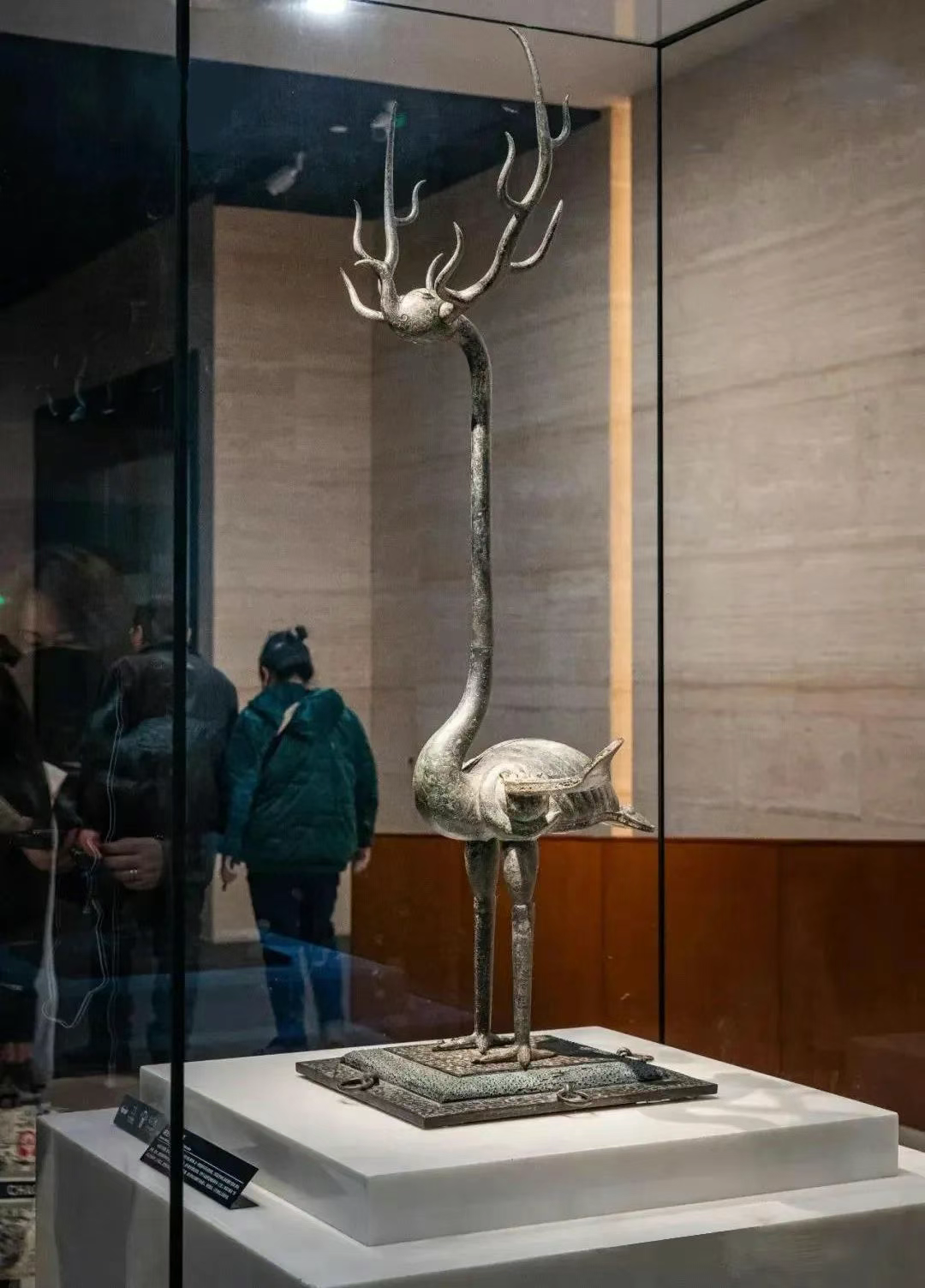 ▲鹿角立鹤。通高143.5厘米,重38.4公斤。为鹿、鹤合体,这件器物出土时放置在墓主人主棺旁,可能意在引领墓主人灵魂升天,或祈求神灵庇佑。(图片来源:湖北省博物馆)