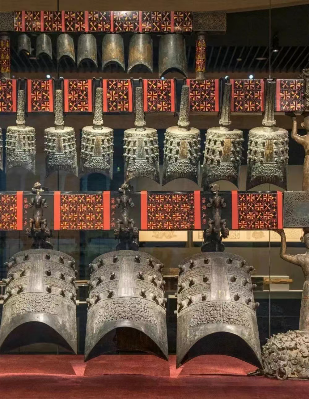 全套编钟65件,不但器形、音响完好,而且编钟的声音和文字对应,绝大多数钟体可以发出两个不同的乐音。