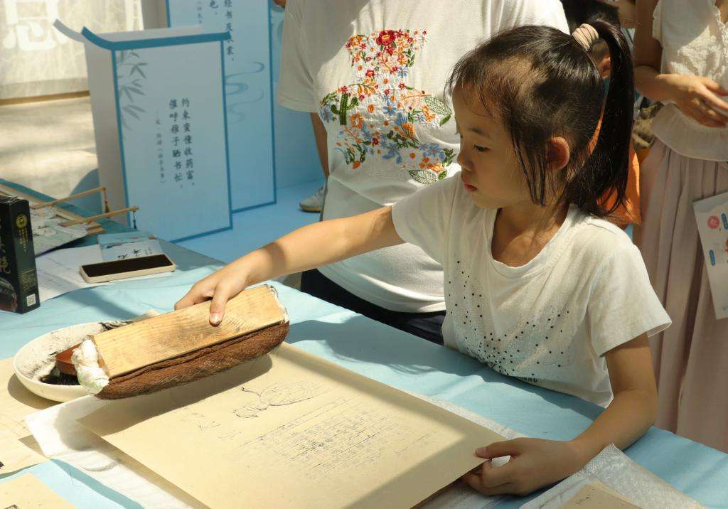 ▲参加晒书会活动的小朋友正在体验雕版印刷。(图片来自中新网)