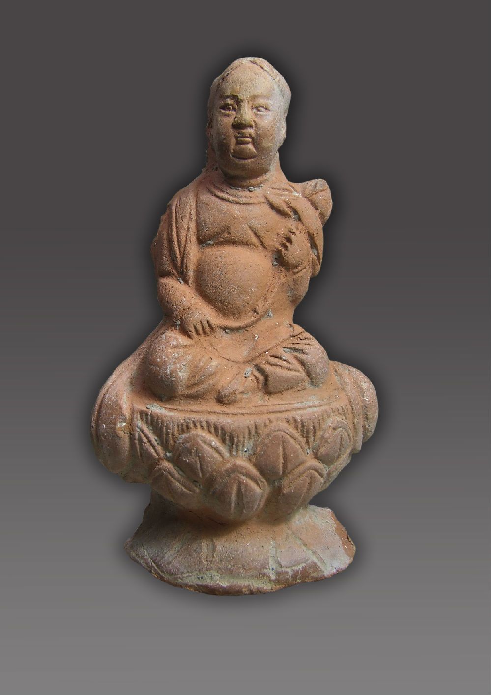 在开封大学大观博物馆中,有一尊宋代白釉红彩磨喝乐坐像。坐像为一童子,其面目清秀,略涂红粉,蚕眉细目,双手持一枝未盛开的莲花于胸前,盘腿而坐,衣襟用红彩勾勒,黑彩勾画眉目。在宋朝,磨喝乐是女子七夕节祭拜的“宠儿”。