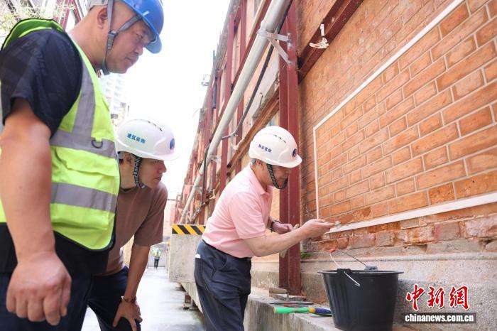 ▲5月29日,“上海工匠”吴公保(右)在上海市静安区某工地修缮石库门清水墙。 中新社记者 汤彦俊 摄