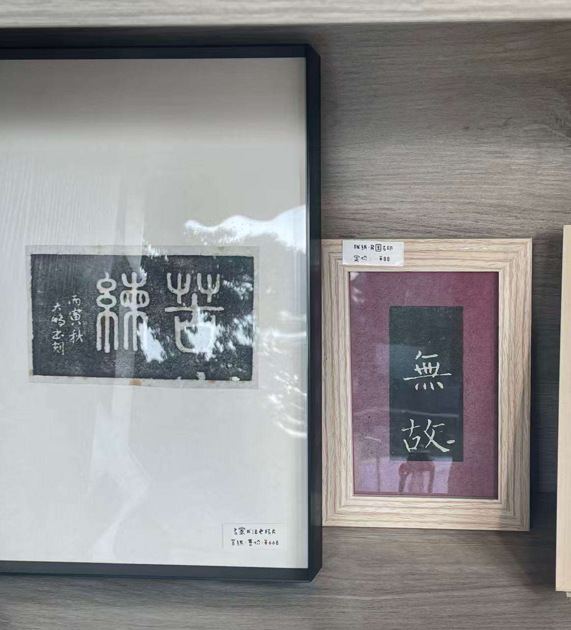 在这些古籍残页中,版画残页因为复刻难度高、稀缺性和文献参考性强,通常价格最高。其次是拓本。随着文物保护力度增强,许多石碑不再允许拓印,早期拓本价值随之水涨船高。红星新闻记者在店内看到,一张仅写着“苦练”(见下图)两个字的“名家书法老拓片”,售价668元。