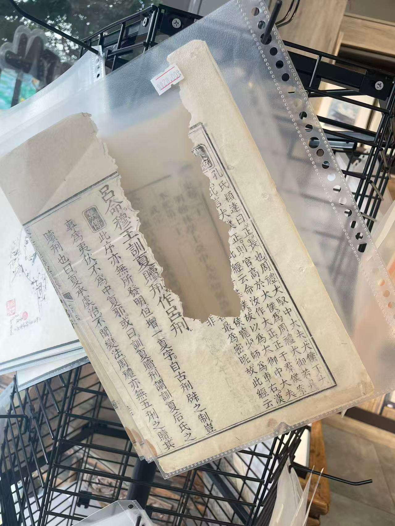 此外,部分价值较高的残页,郭先生将它们集中整理进文件夹里。一本文件夹20张古籍残页,售价2988元。更低的也有,一些残缺严重的古籍,在郭先生眼里就是“没什么用”。比如一页记录《吕刑》的古籍残页,收上来时已经缺了1/3页。这类泛黄的残页被郭先生装进单独的文件袋里,售价28元。他感慨,它们要不是残缺这么多,“一张少说也要卖上百元。”