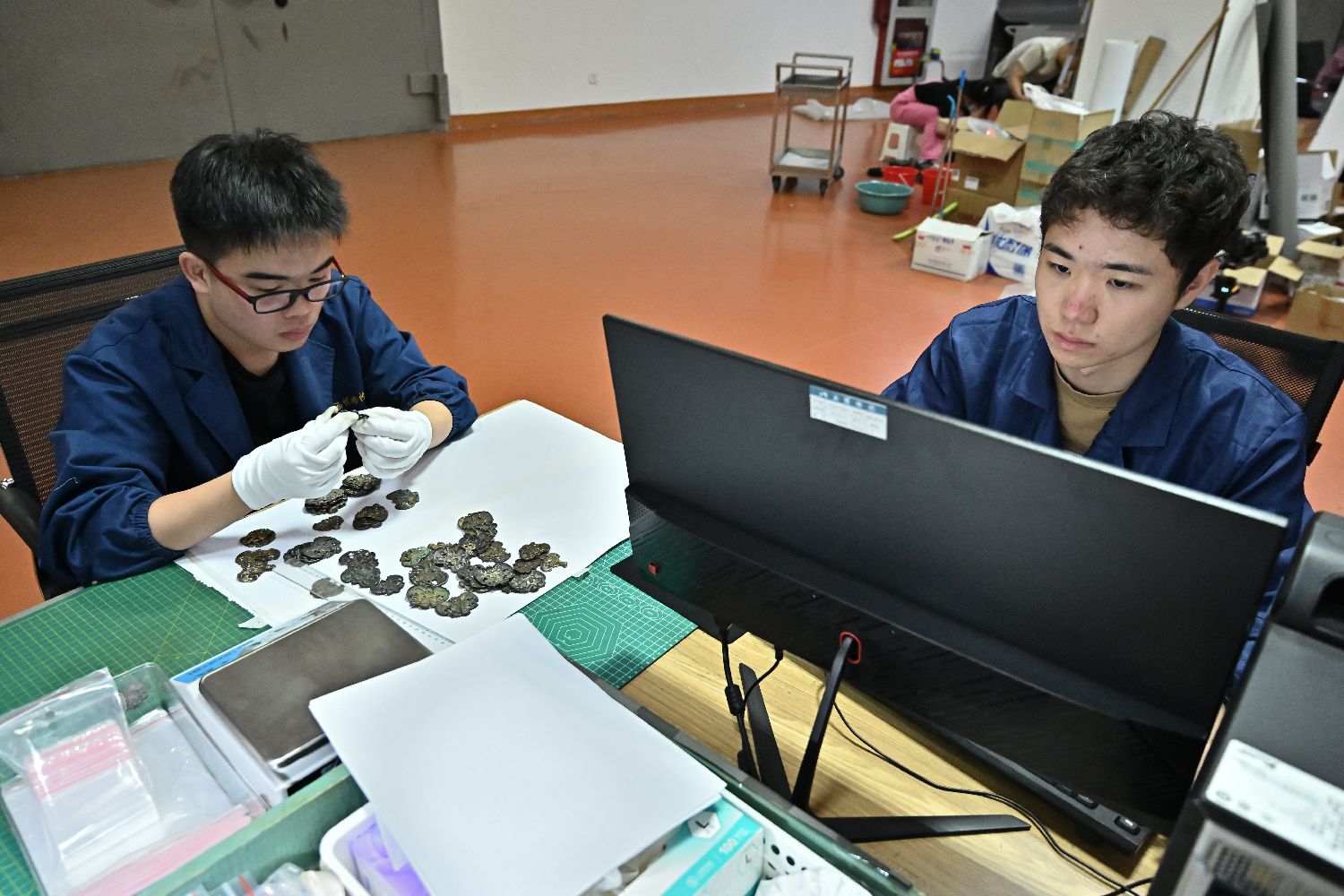 ▲9月9日,台湾青年萧先诚(左)和张育铭在进行文物整理工作。(图片来自中新社)