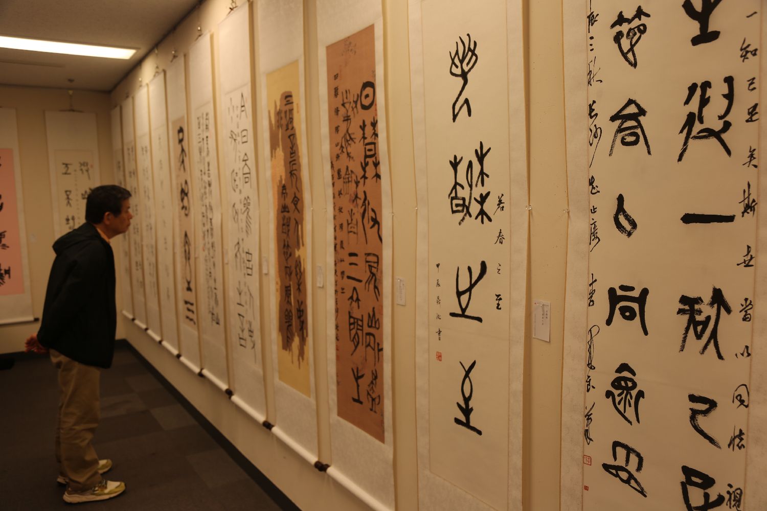 ▲2024年12月18日,日本东京港区,第五届东京国际甲骨文艺术节在东京中国文化中心开幕。图为观众欣赏在现场展出的甲骨文书法作品。(图片来自中新社)