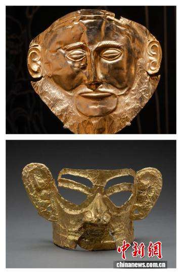 正在四川三星堆博物馆举办的文物精品展上,来自爱琴海的迈锡尼金面具与三星堆金面具因“金面撞脸”而备受关注。