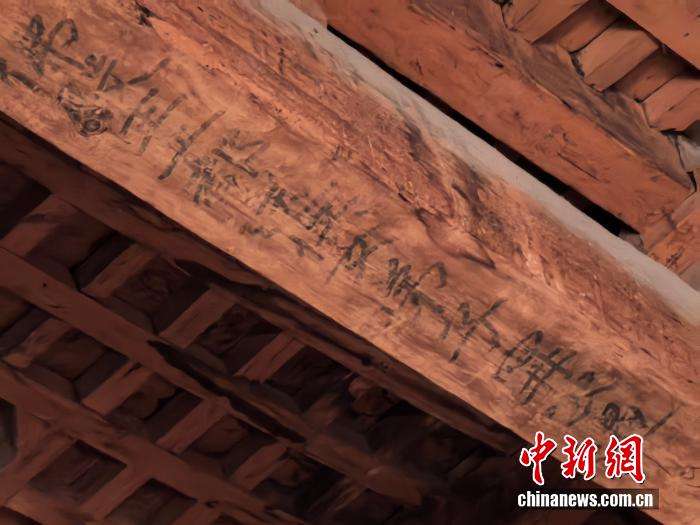 ▲1937年,林徽因在东大殿梁上发现“佛殿主上都送供女弟子宁公遇”的题字。中新社 记者 胡健摄