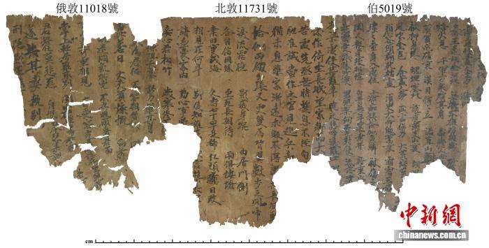 ▲俄敦11018号(现藏俄罗斯科学院东方文献研究所)、北敦11731号(现藏中国国家图书馆)、伯5019号(现藏法国国家图书馆)残片整合后的《孟姜女变文》缀合图。(资料图)(受访者供图)