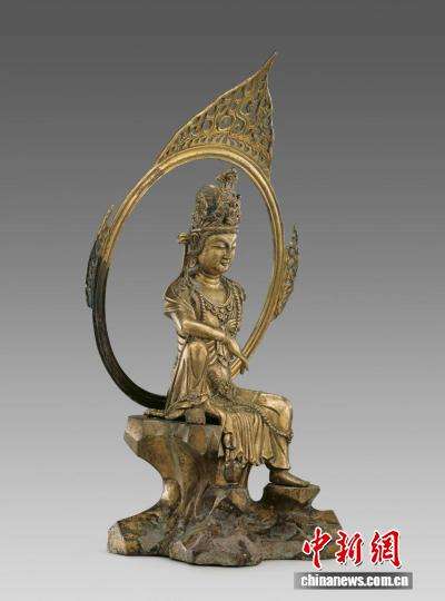 中新网金华9月17日电(董易鑫孙媛媛)高53厘米,整尊观音头戴高冠,冠上饰化佛,身佩璎珞,左臂撑岩,右臂置膝,左腿下垂,右腿上曲足踏岩石,安坐于山岩之上,身旁石上置一净瓶,身后一圆轮状大背光,浑圆精美,边缘装饰火焰纹,仿佛岩前有潺潺流水,观音目观水中月影——这是68年前出土于浙江金华万佛塔地宫的五代鎏金铜观音造像,也叫作“水月观音”,是国家一级文物,现藏于中国国家博物馆。