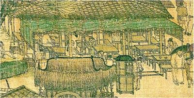 除经营茶饮酒菜外,茶肆还会售卖服饰、字画、文玩之类。《东京梦华录》卷二中记载:“潘楼东去十字街……曰从行裹角,茶坊每五更点灯,博易买卖衣服图画花环领抹之类,至晓即散。”叶梦得《游石林记》:“余绍圣间春官下第,归道灵壁县,世以为出奇石。余时病卧舟中,闻茶肆多有求售”。若是店面较大,有上下两层楼,还可提供其他服务。如《夷坚志》“京师浴堂”条中载,有一外地任职的官员本要到吏部参选,但起得太早,吏部还未上班,于是想着先到一茶邸小憩等待,但他没想到,茶邸中竟是浴室。