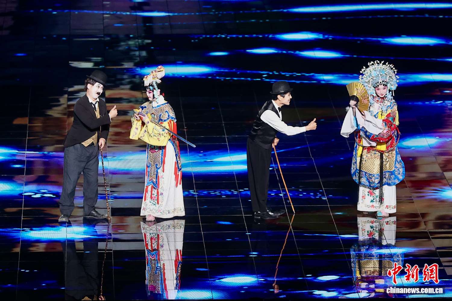 ▲2023年9月14日,2023北京文化论坛文艺晚会在北京石景山首钢滑雪大跳台举行。图为节目《如约》,讲述了梅兰芳和卓别林两位艺术大师的故事。中新社记者 易海菲 摄