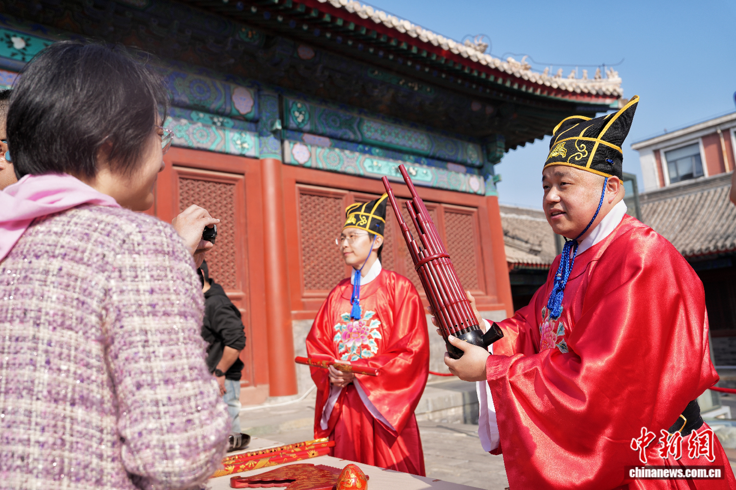 ▲2025年4月10日,北京文化论坛会客厅首场活动在北京天坛公园神乐署举行。图为嘉宾了解中和韶乐乐器。中新社记者 张祥毅 摄