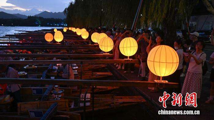 ▲2024年9月17日,众多月亮船在西湖边集结吸引游客。当日是中国传统中秋佳节,浙江杭州西湖景区举行中秋拜月活动。中新社记者 王刚 摄