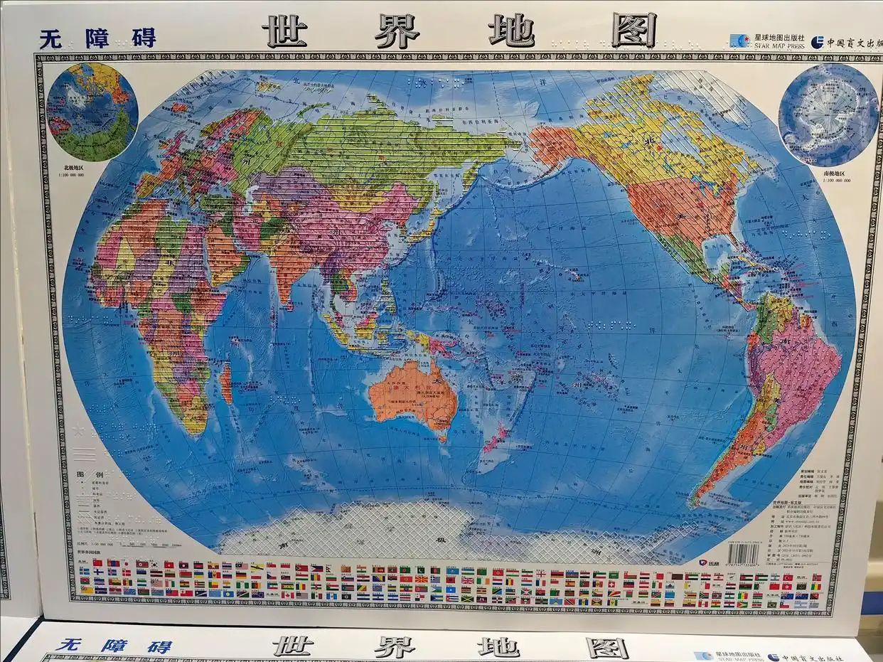 盲文版《无障碍中国地图》和《无障碍世界地图》采用3D滴胶技术批量印刷,加厚耐磨的特种纸,防水防潮,盲文标注与地理轮廓精准对应,确保疆域标注精准无误。