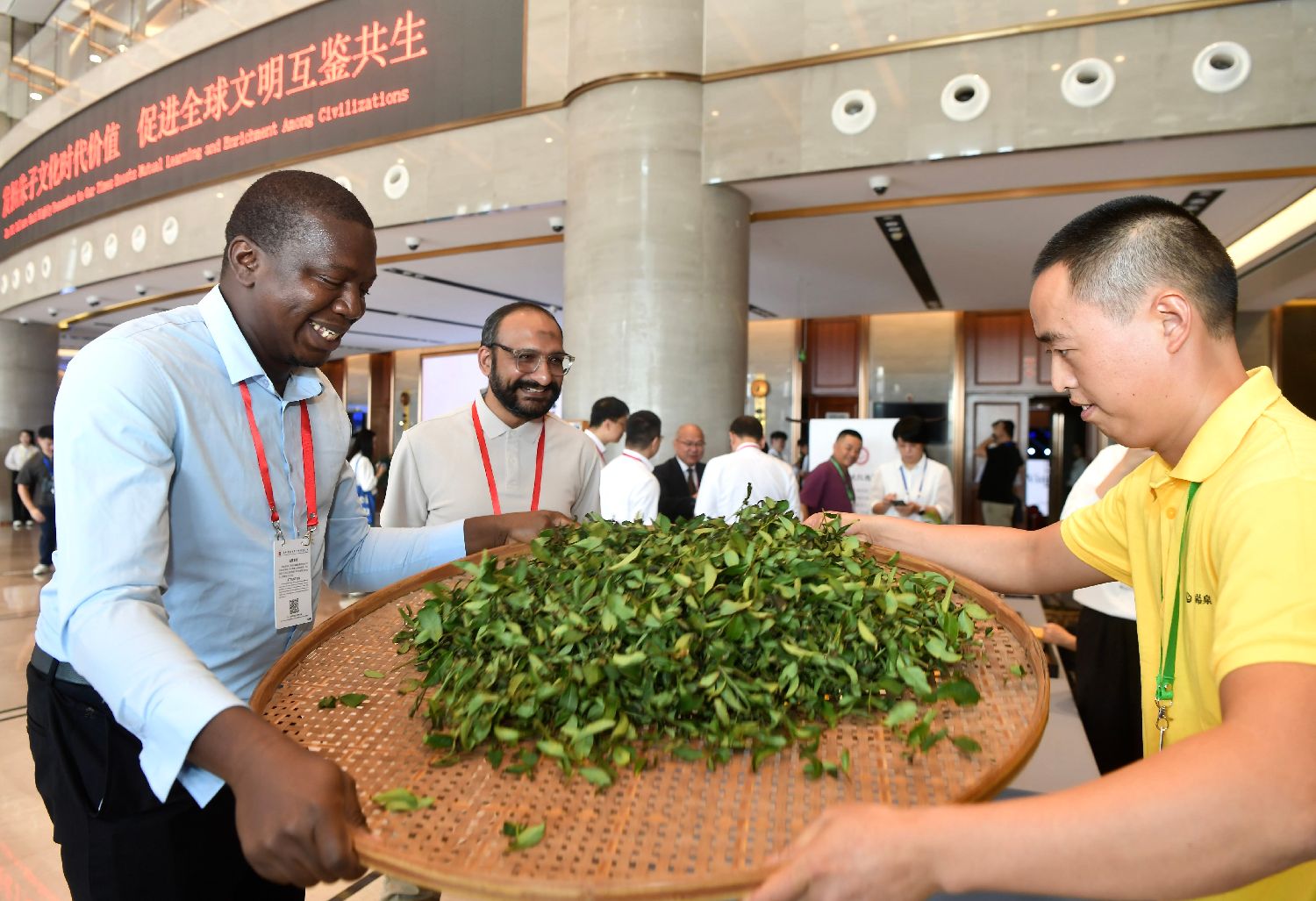 ▲10月18日,朱子学与全球文明对话大会暨第四届考亭论坛在福建省南平市开幕。图为参会外宾在体验武夷岩茶(大红袍)制作技艺。(图片来自中新社)