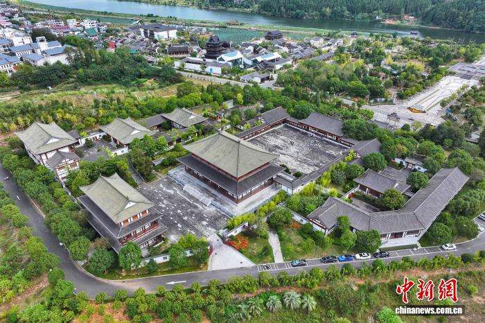 ▲考亭书院由道原堂、集成殿、太极广场和庆云楼等仿古建筑群构成。图为航拍考亭书院全景。吴大灼摄