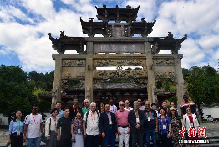 ▲10月19日,海内外嘉宾在考亭书院牌坊前合影。中新网记者张丽君摄