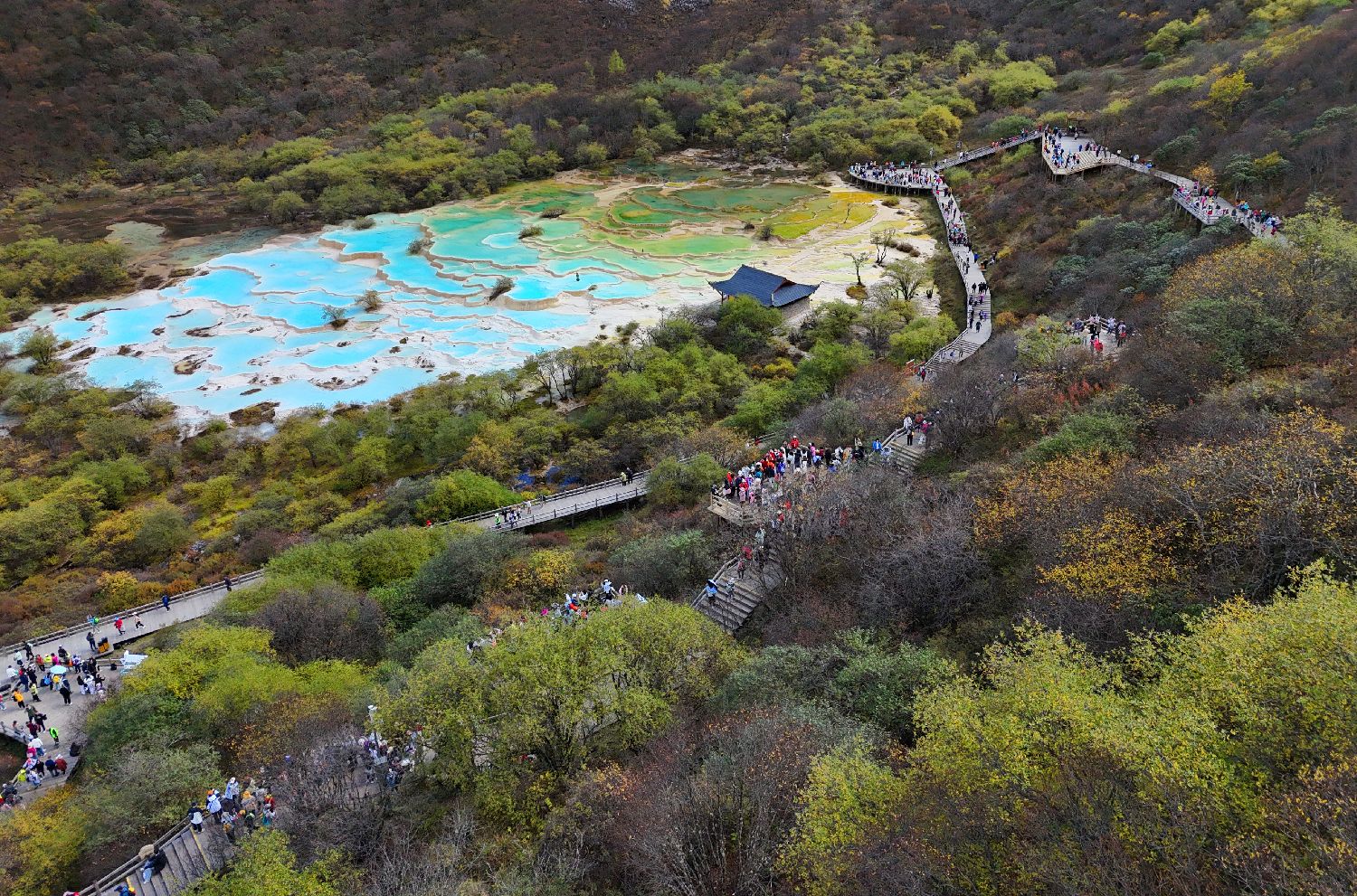 ▲10月14日,世界自然遗产——四川黄龙风景名胜区景色如画。图为五彩池风光。(无人机照片)(图片来自中新社)