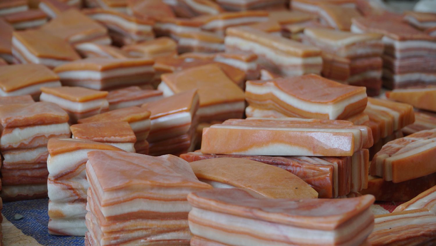 ▲2022年10月31日,广西柳州市柳城县六塘镇,论斤售卖的猪肉石。猪肉石是一种天然石种,大多产自于柳城县,因纹理形似新鲜猪肉而得名。与真实猪肉相同,猪肉石也论斤售卖。(图片来自中新社)