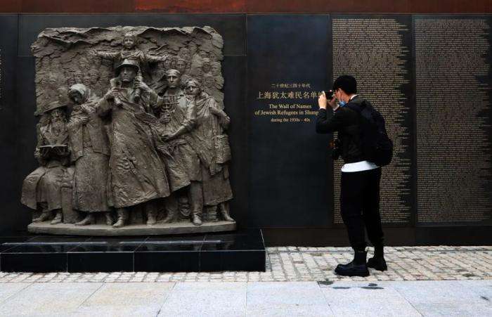 ▲参观者拍摄上海犹太纪念馆外的浮雕。(资料图)中新社记者汤彦俊 摄